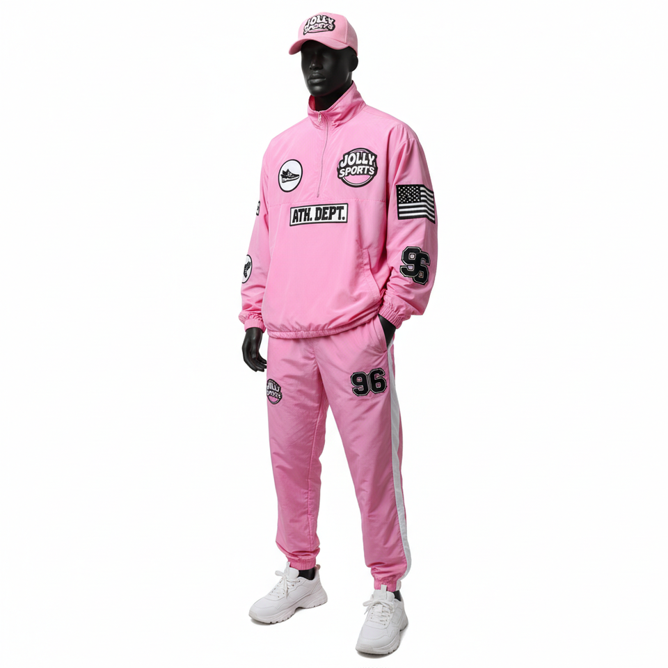 ชุดเสื้อกันลมไนล่อนโพลีเอสเตอร์220 GSM ขนาดพิเศษสีชมพูพร้อมแผงด้านข้างสีขาวชุดกันลมปักโลโก้ได้ตามต้องการ