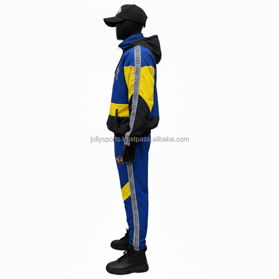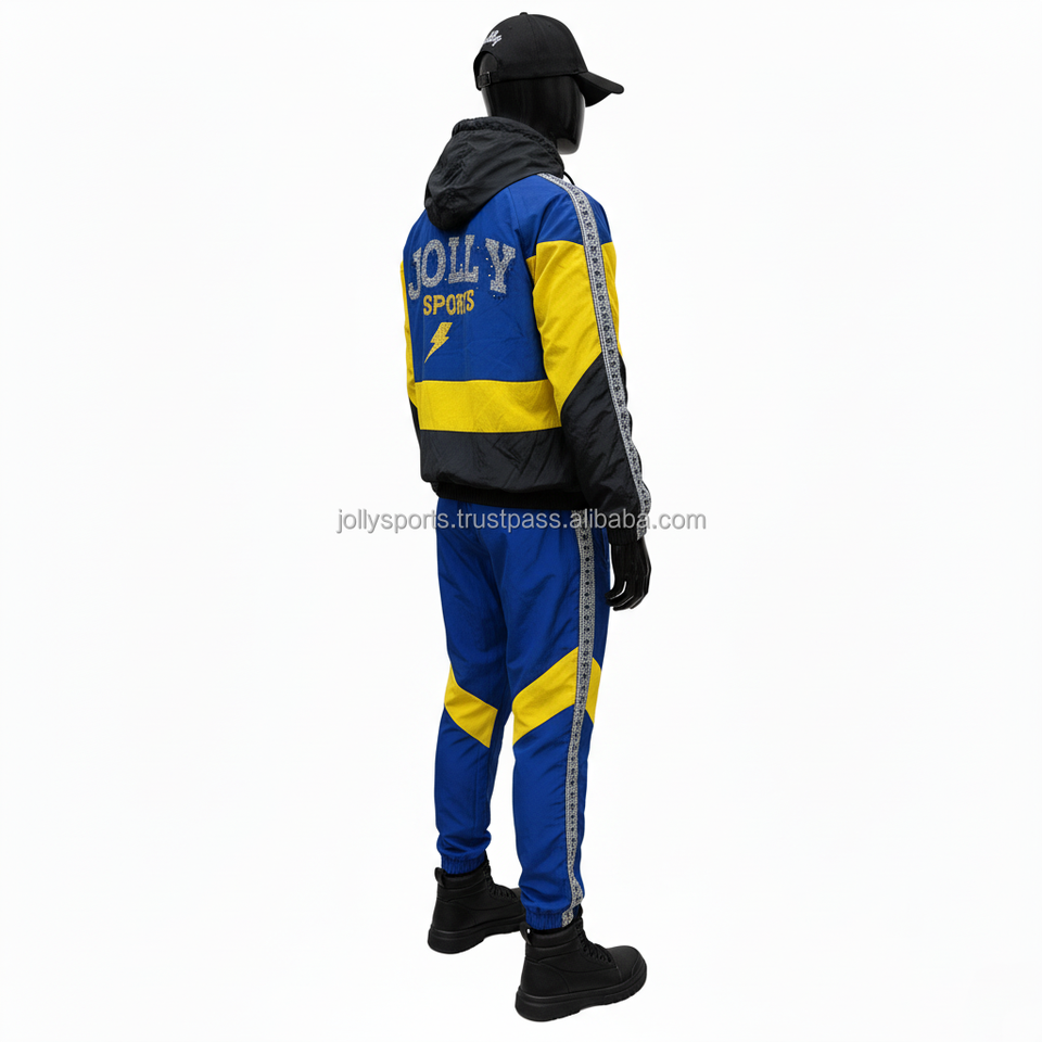 ชุดเสื้อกันลมผ้าไนลอนพรีเมี่ยมขนาดใหญ่พิเศษเซตเสื้อกันลมสำหรับเล่นกีฬาแบบซิปทั้งชิ้นดีไซน์บล็อกสีฟ้าสีเหลือง