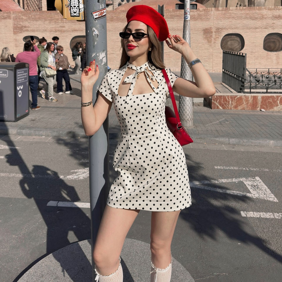 เดรสสั้นพิมพ์ลายจุดผูกโบว์ทรงเข้ารูปแขนสั้น y2k สาวฮอตเซ็กซี่หรูหราเดรสใหม่