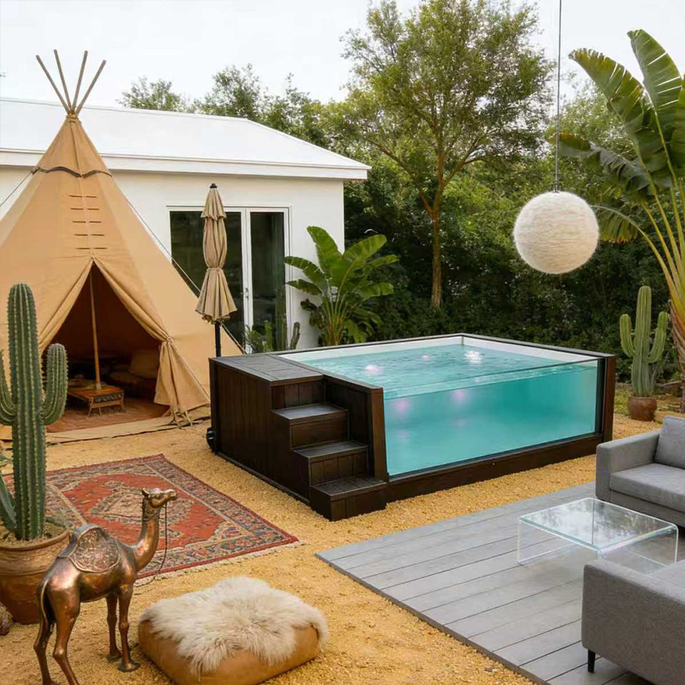 สระว่ายน้ำไฟเบอร์กลาสทรงสี่เหลี่ยมสำหรับตั้งบนพื้นดิน เหมาะสำหรับบ้าน สวนหลังบ้าน เด็กๆ สามารถเล่นน้ำได้ พร้อมไฟ LED ป้องกันรังสียูวี และเป็นมิตรกับสิ่งแวดล้อม