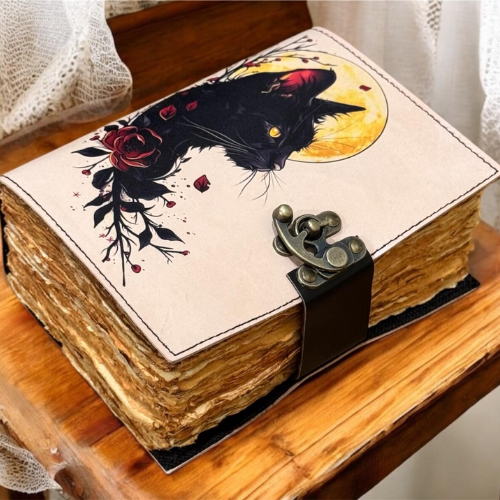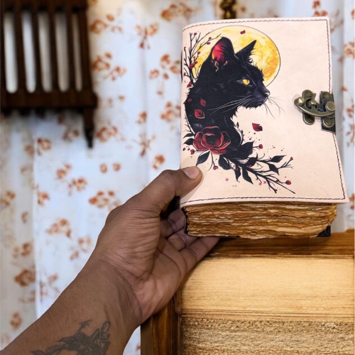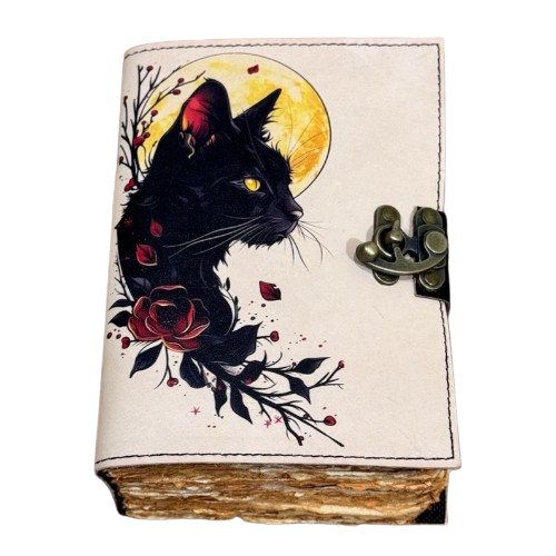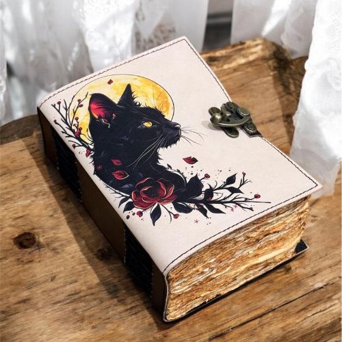 printed Cat Leather Journal Vintage Hardcover Wiccan Spell Book