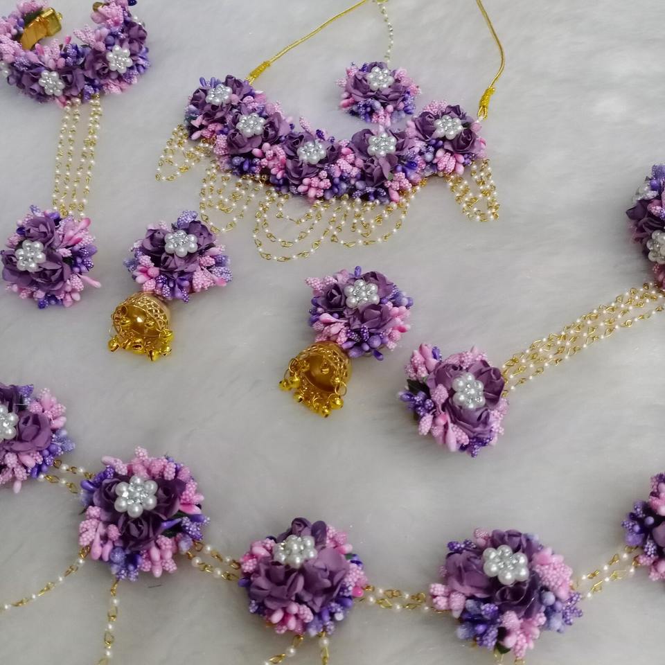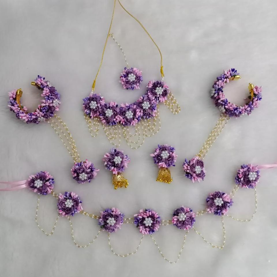 ชุดเครื่องประดับดอกไม้ Mayo สีม่วงทำด้วยมือกับเปลือกหอยวัวสำหรับเจ้าสาว haldi mehindi