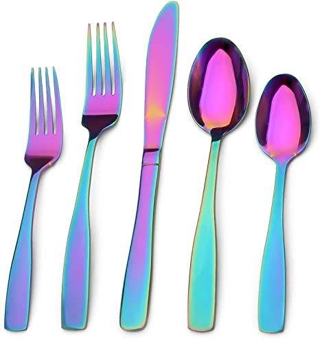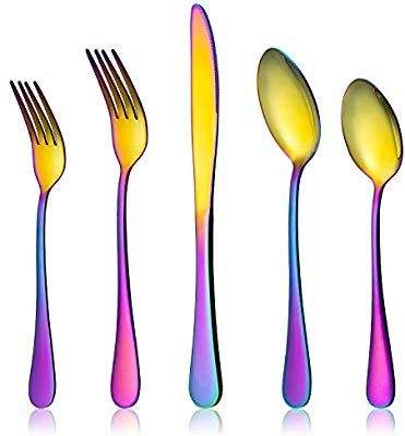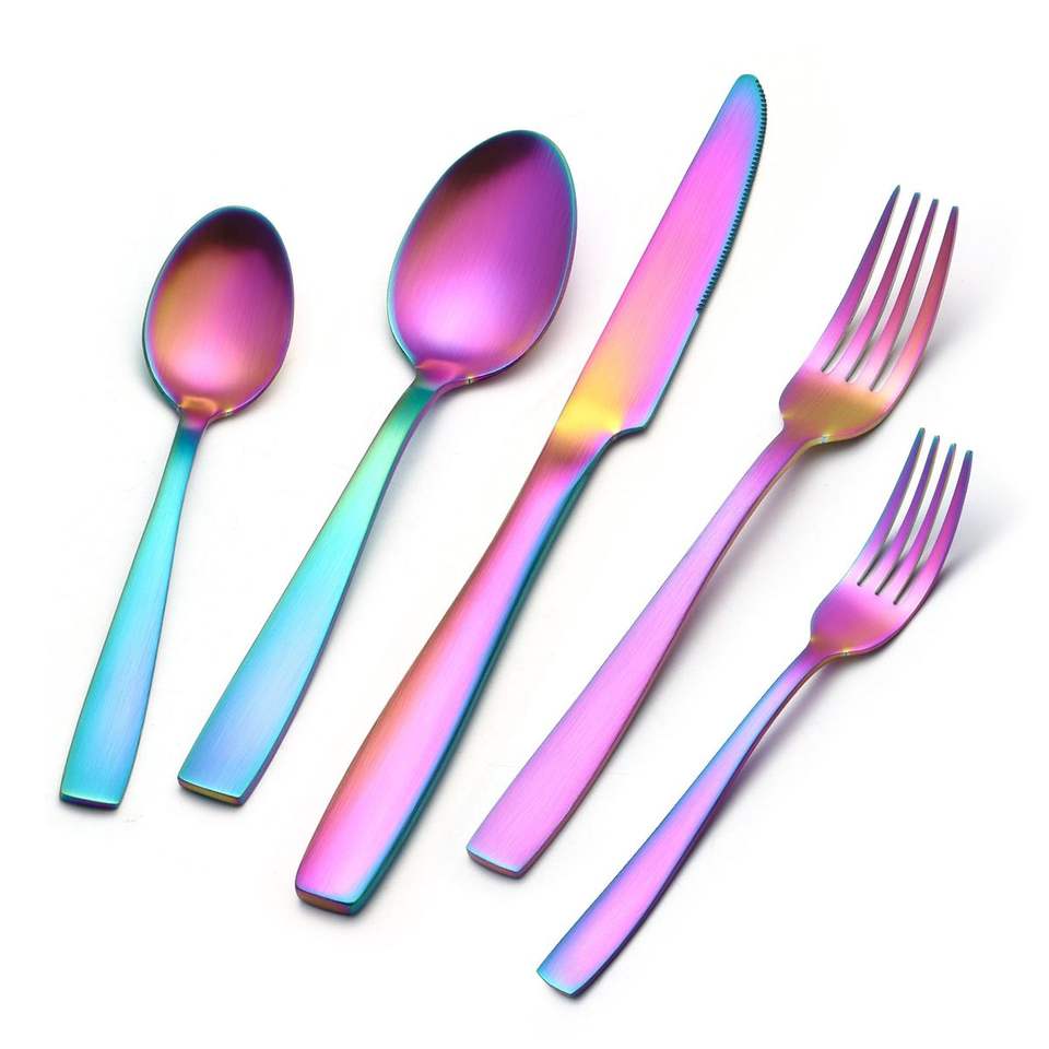 ชุดช้อนส้อมสีรุ้งที่มีชั้นสีเงาสดใสนำเสนอความสง่างามที่ทันสมัยสำหรับการรับประทานอาหารที่บ้านและพิเศษ