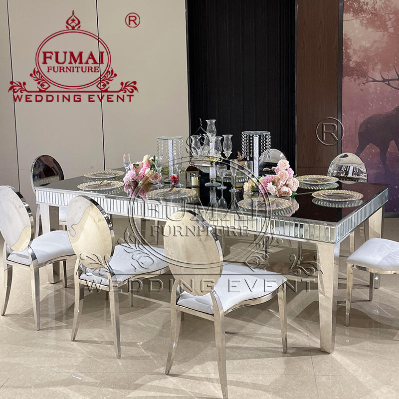 โต๊ะจัดเลี้ยงอาหารทรงสี่เหลี่ยมผืนผ้าพร้อมกระจกเคลือบเงาสีดำและขาเรียวสแตนเลสสีเงิน