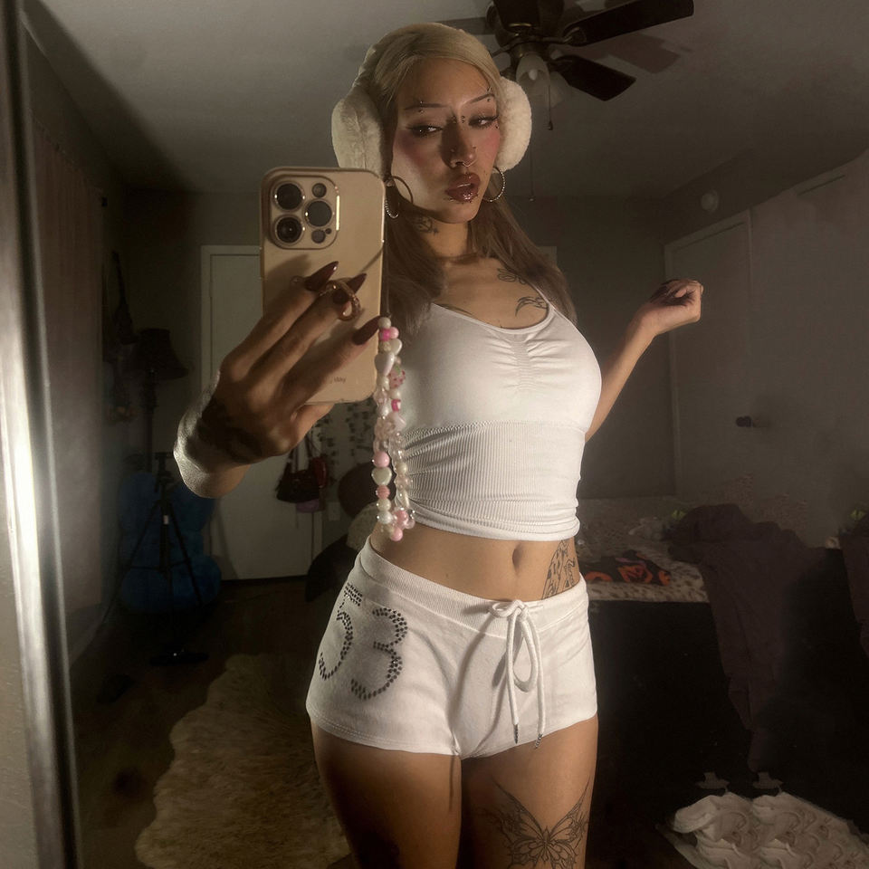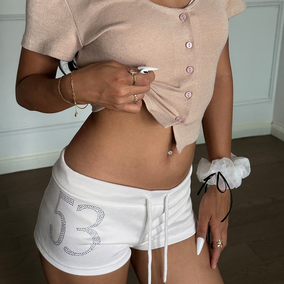 กางเกงขาสั้นเอวต่ำแบบมีเชือกผูก ประดับด้วยคริสตัล ยางยืด ทรงสปอร์ต สีขาว สำหรับสาวเซ็กซี่