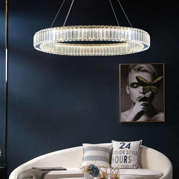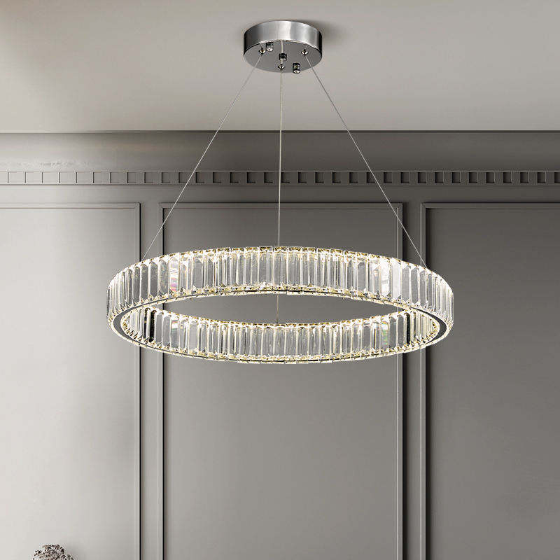 ไฟระย้ารูปทรงวงแหวนปรับความสูงได้แบบเรียบง่ายห่วงคริสตัล LED โคมระย้าห้องนั่งเล่น