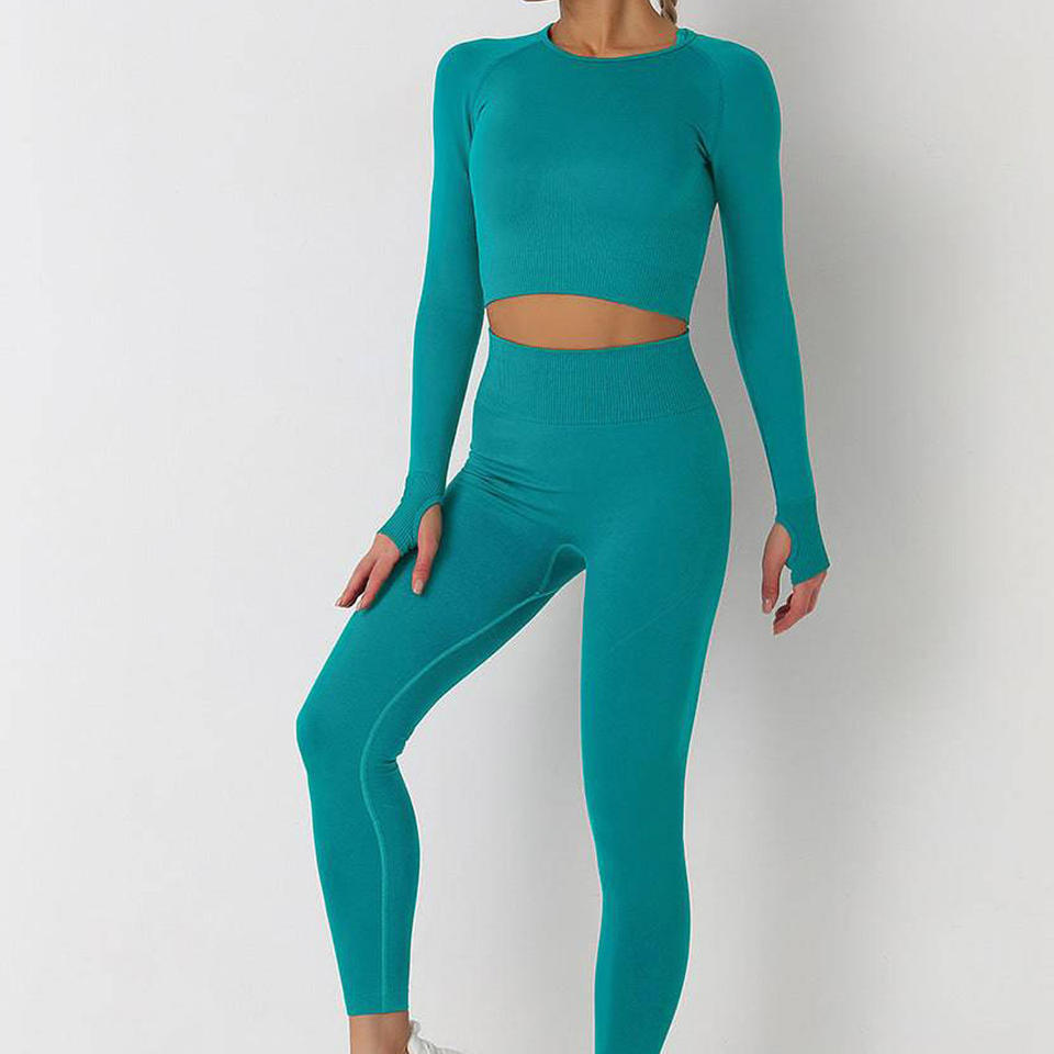 ชุดโยคะผ้าเนื้อนุ่มคุณภาพสูงสำหรับผู้หญิง ชุดออกกำลังกายสองชิ้น ยืดหยุ่นไร้รอยต่อ รับผลิตตามแบบ OEM ชุดออกกำลังกายสำหรับผู้หญิง