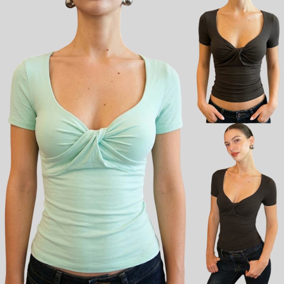 เสื้อยืดแขนสั้นอเนกประสงค์สำหรับเด็กผู้หญิงเสื้อทรงสลิมฟิตคอกลมเซ็กซี่สีล้วนบิดเกลียวต่ำ