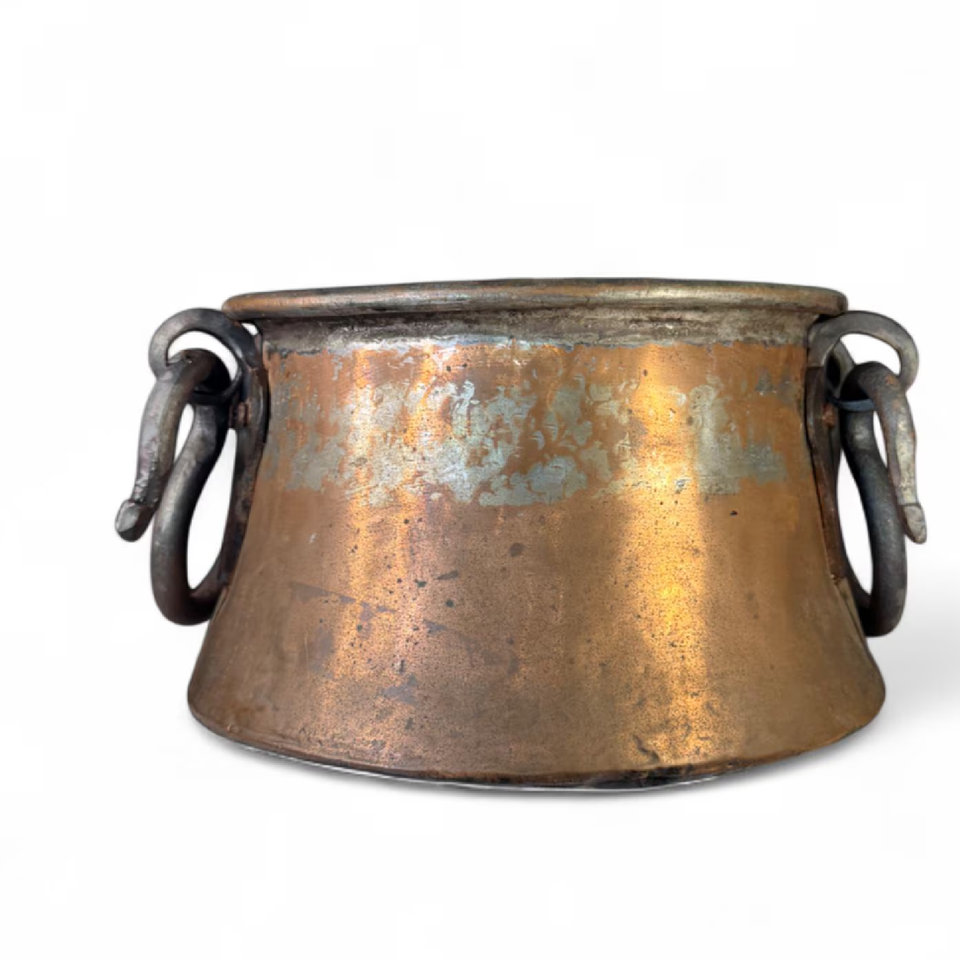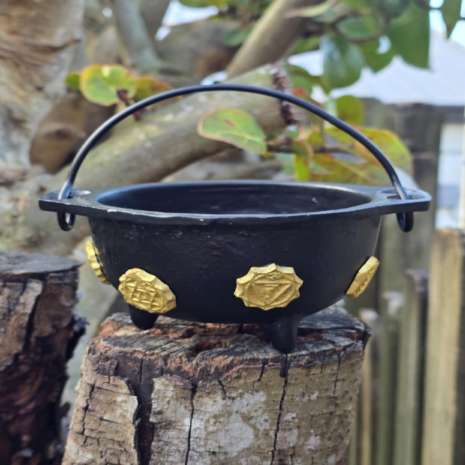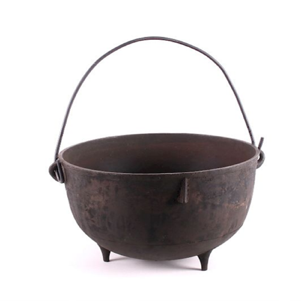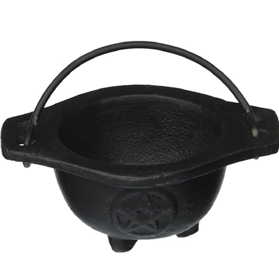 หม้อเหล็กสีดำแบบหมอบที่มีขอบแบนกว้างด้ามจับประกันตัวและรูปดาวห้าแฉกนูนด้านล่างเหมาะสำหรับการถือขนาดเล็ก