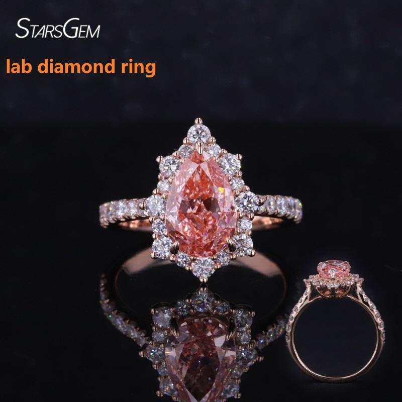 แหวนเพชรแท้สำหรับปลูกในห้องปฏิบัติการสีชมพูสดใสรูปลูกแพร์สีโรสโกลด์14K 10K ประดับเพชรแท้