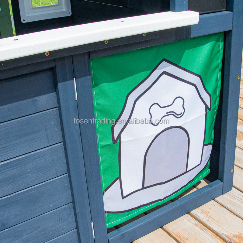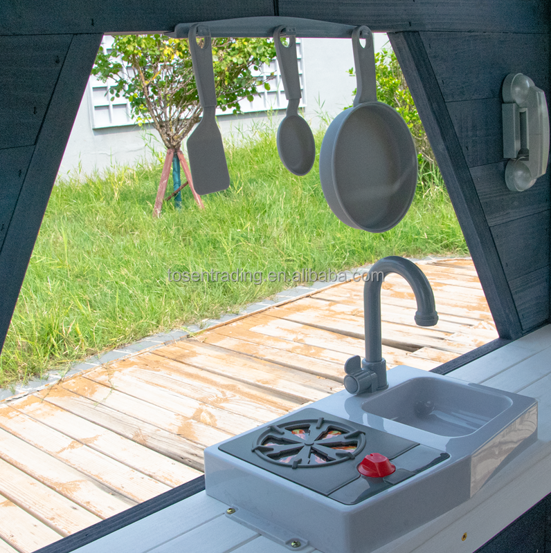 บ้านไม้กลางแจ้งแข็งแรงทนทานพร้อมประตูสีเขียว กล่องดอกไม้สีขาว ปล่องไฟ และครัวเล่น - บ้านเล่นสำหรับเด็กในสวนหลังบ้าน