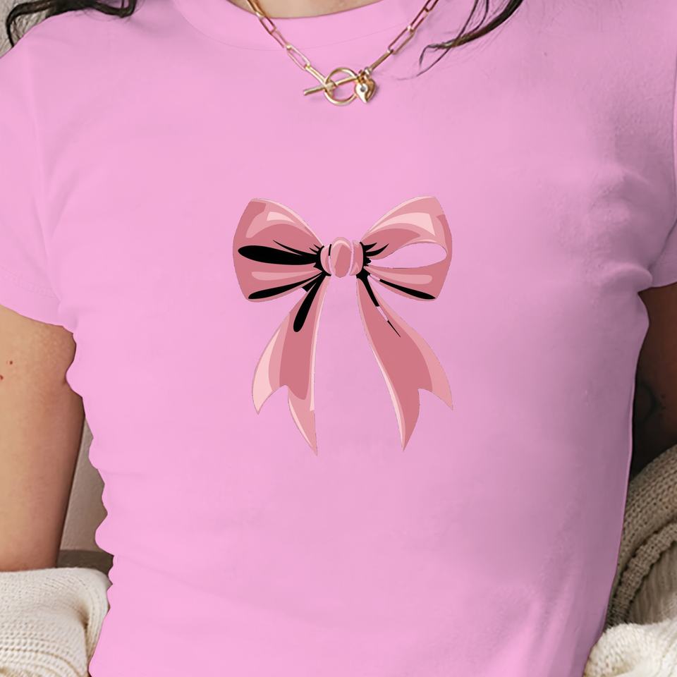 เสื้อยืดแขนสั้นผู้หญิงทรงเข้ารูปพิมพ์ลายโบว์สีชมพู Y2K
