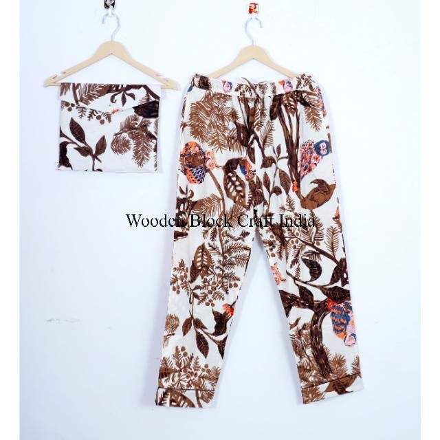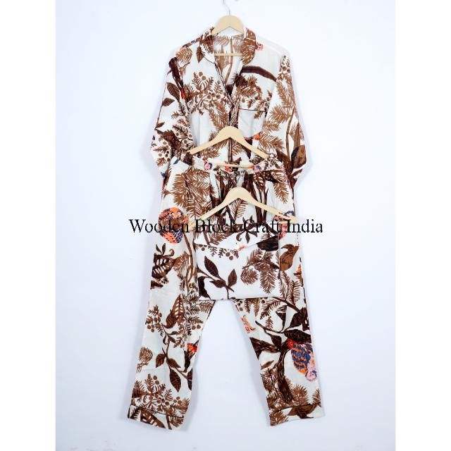 ชุดนอนผ้าฝ้ายออร์แกนิคพิมพ์ลายนกฮูกเขตร้อน แขนยาว สไตล์วินเทจ ชุดนอนลำลองเข้าชุดกัน สไตล์โบโฮ สำหรับนอนหลับ