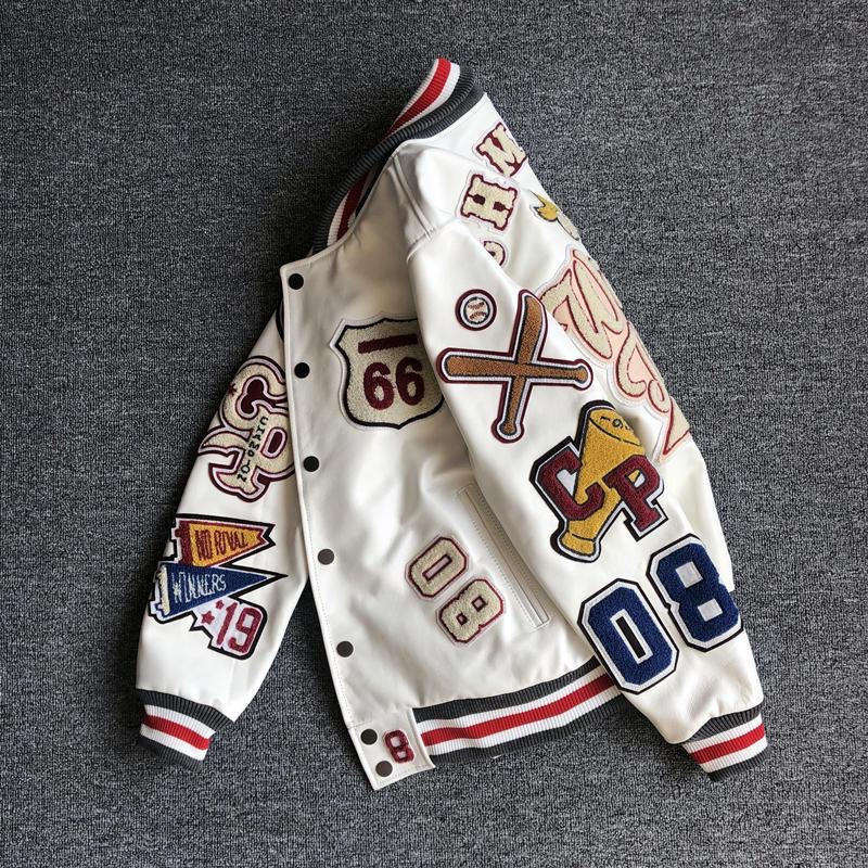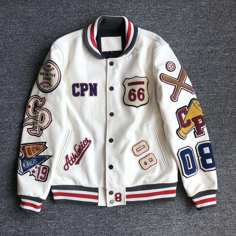 เสื้อแจ็กเก็ตทีมเบสบอลแขนเสื้อหนังสีตัดกันเสื้อแจ็กเก็ตบอมเบอร์เสื้อแจ็คเก็ตลำลองสตรีทแวร์
