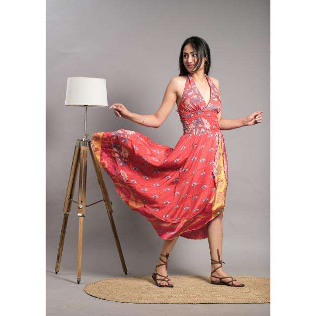 เดรสผ้าไหมสไตล์วินเทจสำหรับผู้หญิง ทรงเอไลน์ คอ halter แต่งลูกไม้ ความยาวปานกลาง เหมาะสำหรับฤดูใบไม้ผลิ/ฤดูใบไม้ร่วง ดีไซน์เปิดหลัง เอวสม็อค ผ้าทอ ซักได้