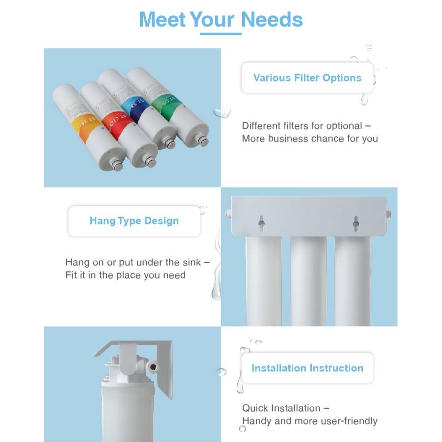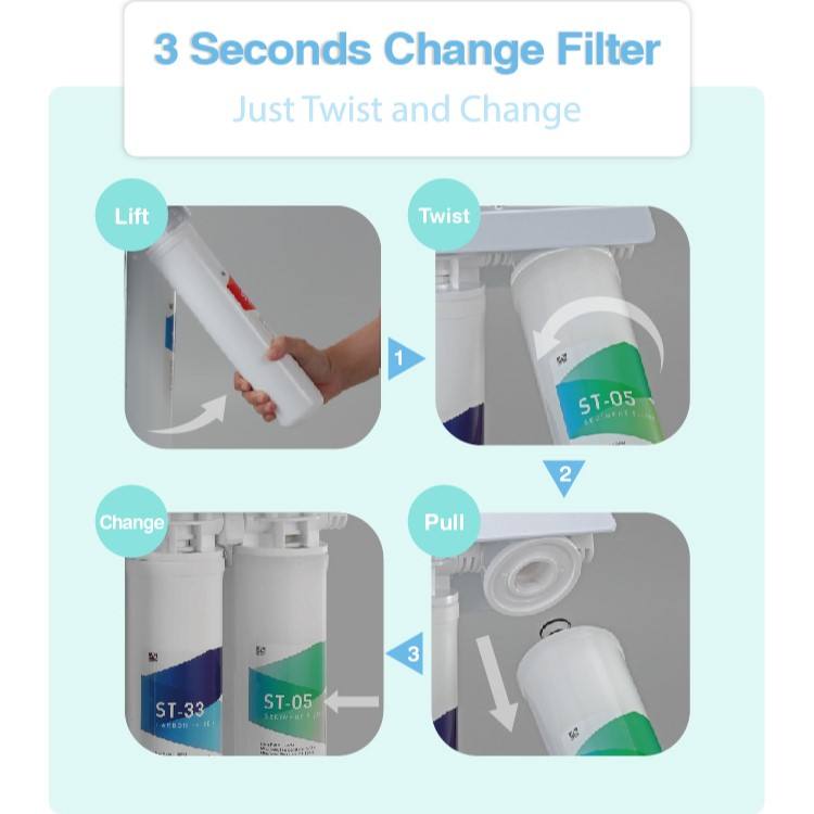 เครื่องกรองน้ำใช้ในบ้านแบบตั้งโต๊ะ 4 ขั้นตอน พร้อมไส้กรองแบบเปลี่ยนเร็ว หมุนได้ 90 องศา ติดตั้งง่าย ใช้บนเคาน์เตอร์
