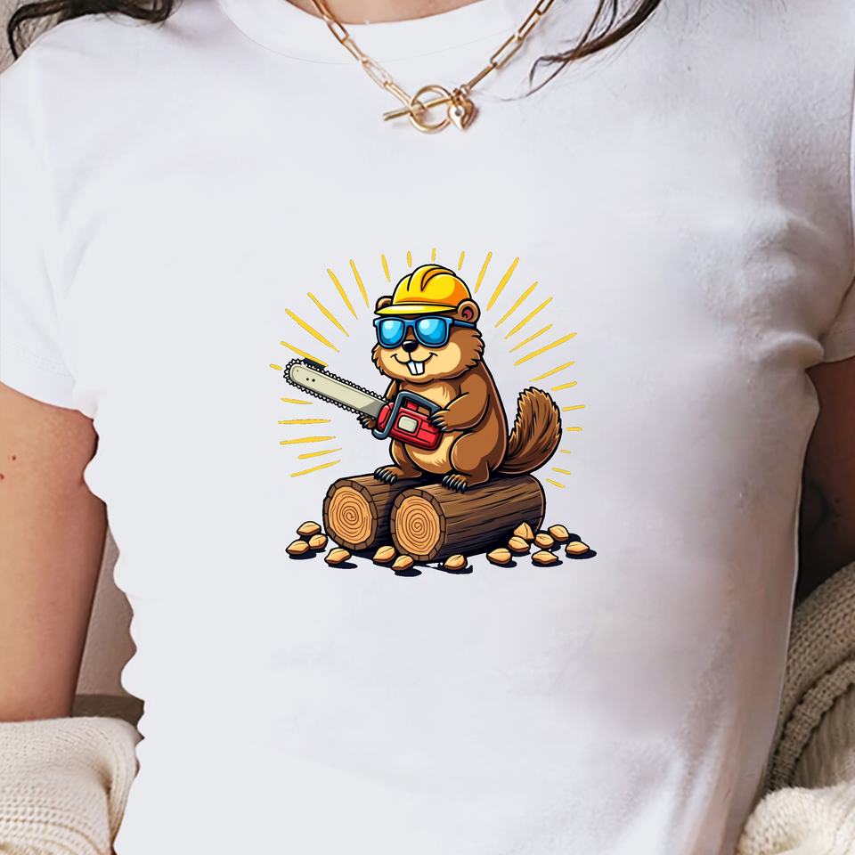 เสื้อยืดสั้นแฟชั่นบีเวอร์แปลกๆกับเลื่อยโซ่