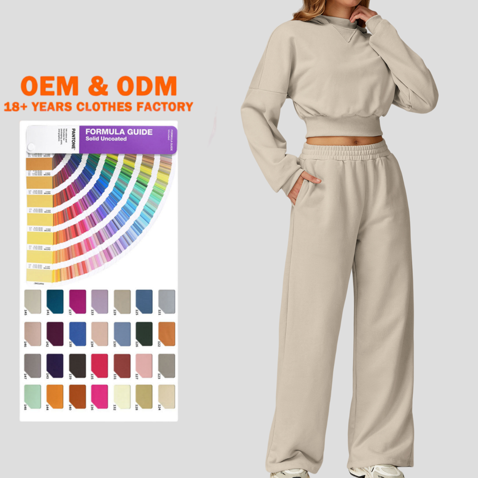 ชุดกีฬาผู้หญิงแบบขายส่งสั่งทำได้ ชุดเซ็ตสองชิ้น เสื้อฮู้ดผ้าฟลีซสีพื้นแบบสวมใส่สบายสำหรับฤดูใบไม้ร่วง กางเกงขายาวพิมพ์ลายพัฟฟ์ ชุดวอร์ม