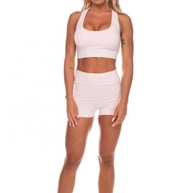 ชุดเล่นโยคะฟิตเนสยิมกีฬาฤดูร้อนของผู้หญิงชุดใหม่บราและกางเกงขาสั้นผ้ายืดไร้รอยต่อน้ำหนักเบาสีพื้น
