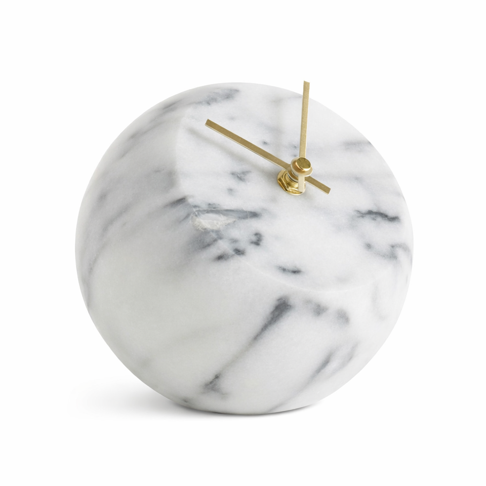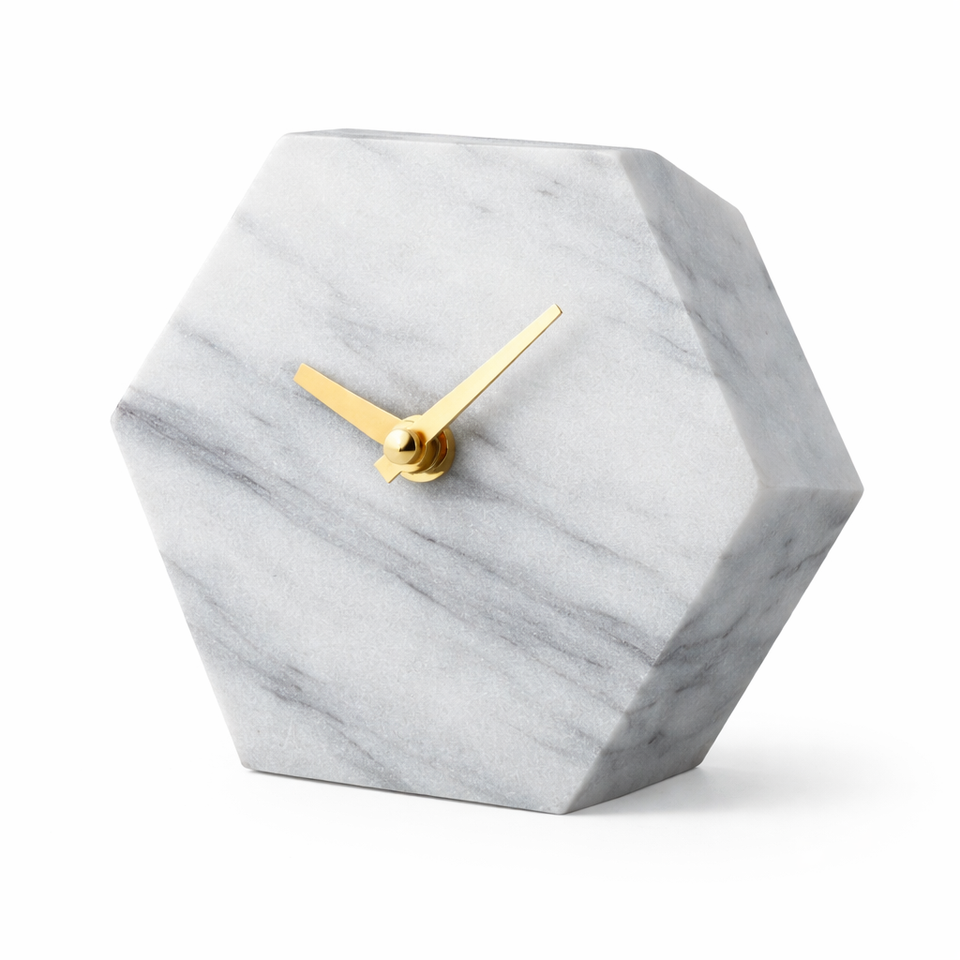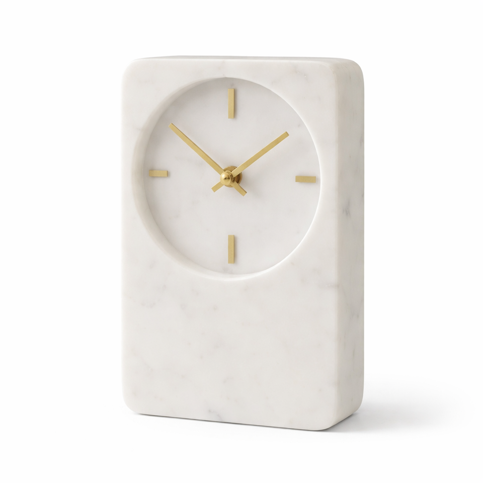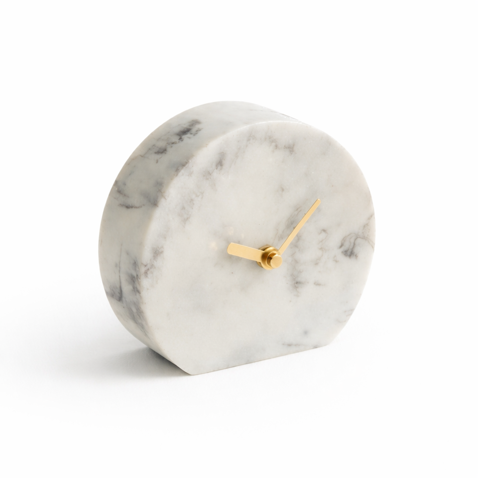 นาฬิกาตั้งโต๊ะหินอ่อนสีขาวหรูหรา พร้อมตกแต่งด้วยทองเหลือง ดีไซน์โค้งมนไม่ซ้ำใคร สำหรับสำนักงาน ห้องนั่งเล่น ของขวัญตกแต่งบ้านสไตล์โมเดิร์น ราคาขายส่ง