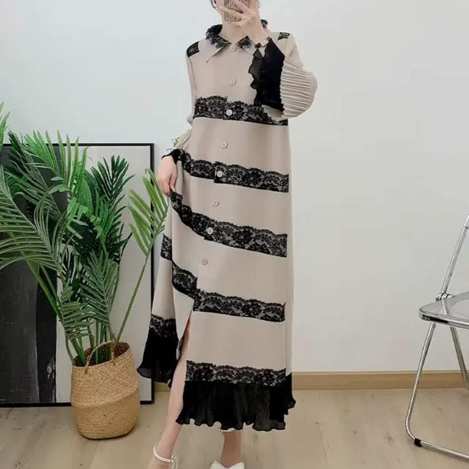 เดรสยาวทรงปล่อยคอวีผ้าทอลายลูกไม้สไตล์สตรีทแวร์สำหรับผู้หญิง ขายส่ง คุณภาพสูง กระดุมแถวเดียว จับจีบ คอปกพับได้