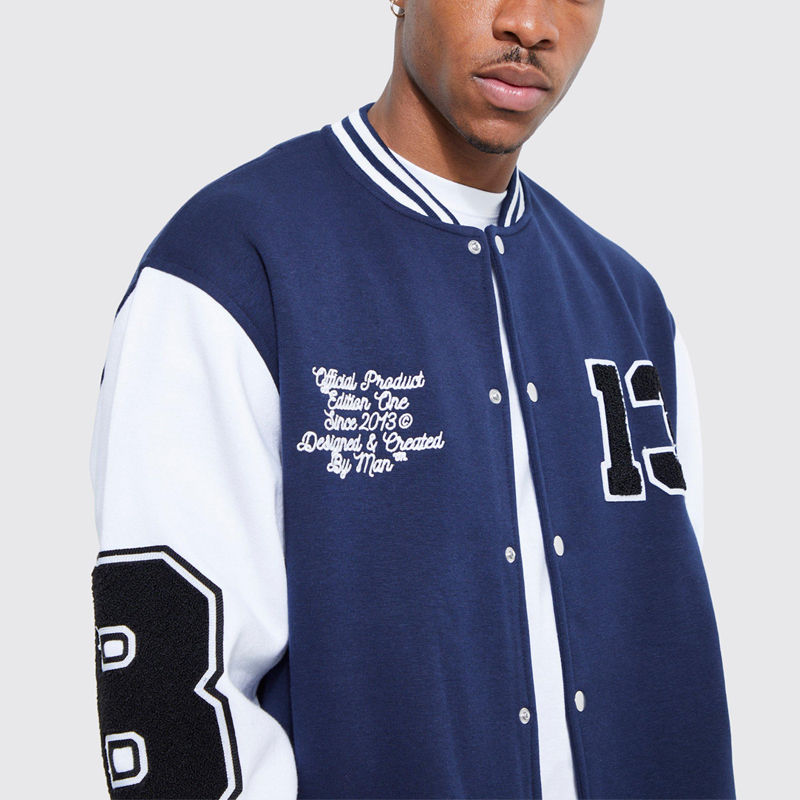แจ็คเก็ตฤดูหนาว ปักโลโก้ตามสั่ง แขนหนัง ปักลาย แจ็คเก็ตเบสบอลผู้ชายสีดำ แจ็คเก็ต Letterman สีฟ้าอ่อน แจ็คเก็ต Varsity