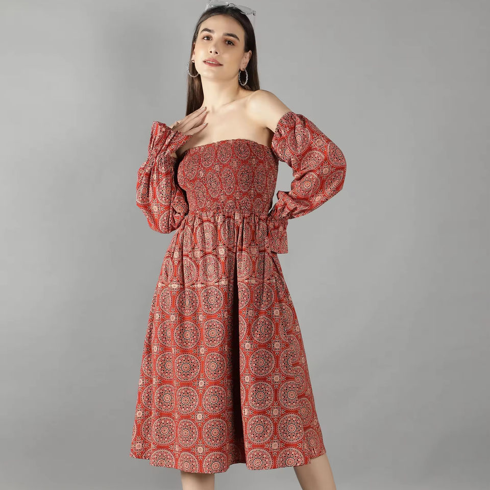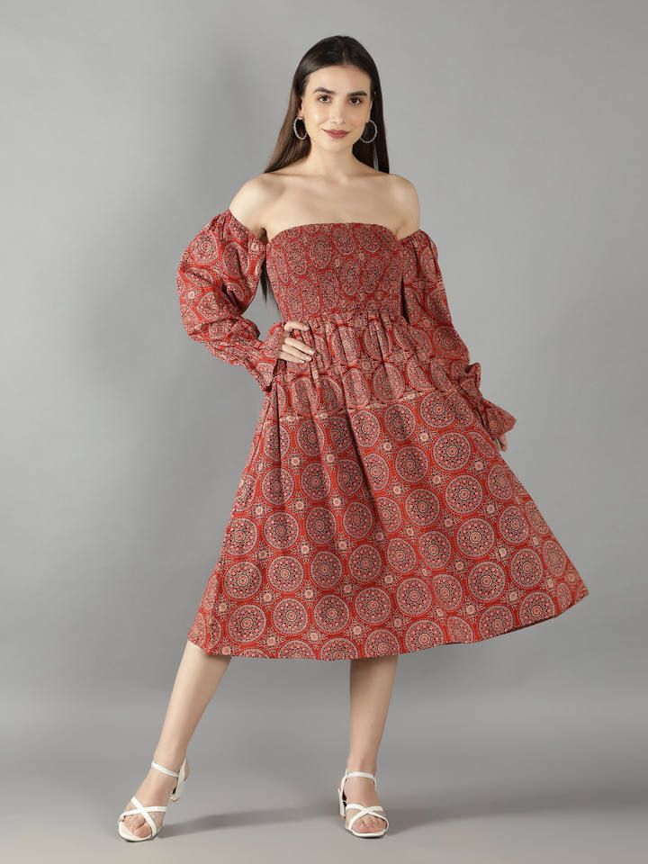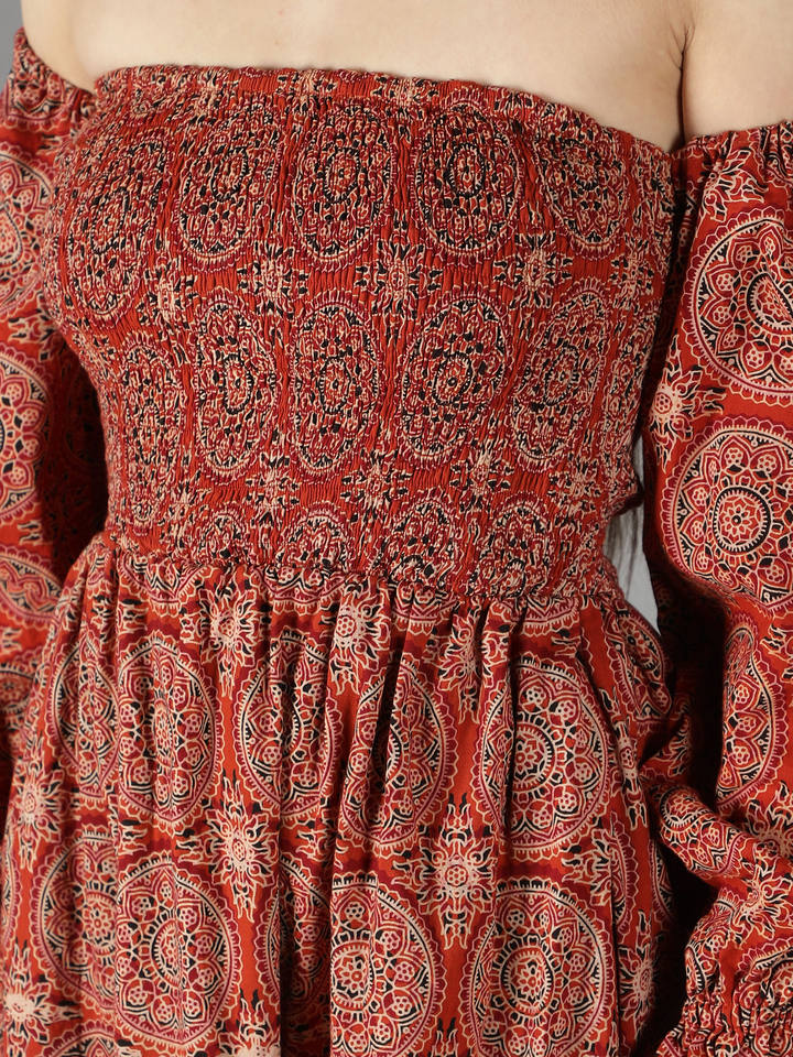 ชุดเดรสควันเปิดไหล่พิมพ์ลาย Ajrak สีส้มเผาไหม้ลำลองแขนพองเป็นวงกลมชุดเดียวชุดฤดูร้อนมีสไตล์