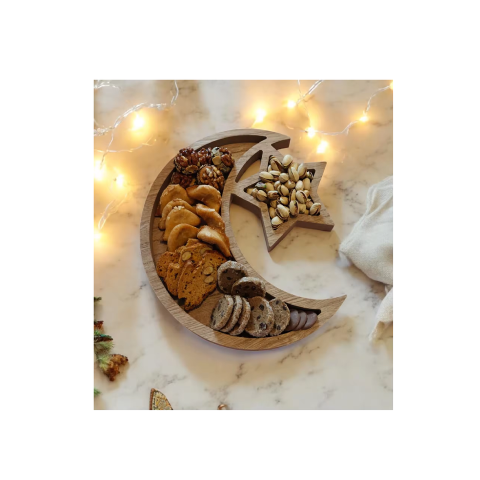 ถาดไม้สำหรับใส่ช็อกโกแลตแบบพิเศษสำหรับเทศกาลอีดมูบารัค รูปพระจันทร์เสี้ยวและดาว เหมาะสำหรับงานแต่งงาน ใช้ในบ้าน หรือในช่วงรอมฎอน