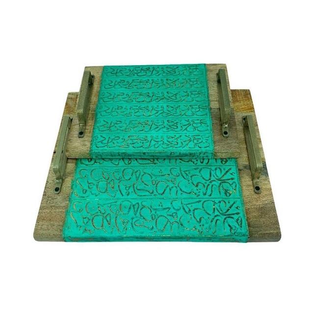ถาดไม้สำหรับเสิร์ฟขนมอิสลามพร้อมที่จับโลหะสำหรับบ้านและโรงแรมดีไซน์ล่าสุด