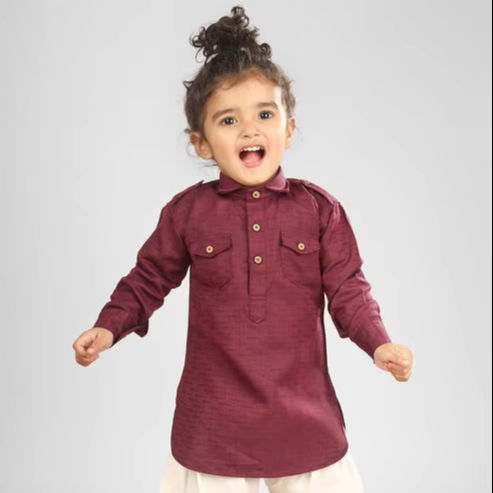 เด็กชายสวมชุดคุรตะแบบดั้งเดิมพร้อมกระดุมไม้ รายละเอียดเสื้อผ้าพื้นเมืองที่มีสไตล์ ภาพเหมือน