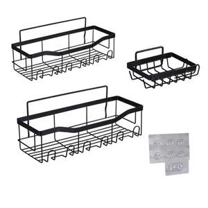 ที่จัดระเบียบห้องน้ำแบบไม่ต้องเจาะ ติดผนังด้วยกาว ชั้นวางมุมห้องน้ำพร้อมตะขอ ที่วางสบู่ สีดำ