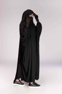 จิลบับสีเขียวเข้มมีระบายเต็มรูปแบบพร้อมผ้าไนกาบแบบเข้าคู่ที่ออกแบบมาสำหรับความสุภาพเรียบร้อยของอิสลามและสง่างามที่มีเนื้อผ้าไหล