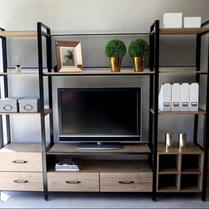 ขาตั้งทีวีโลหะขนาดใหญ่ดีไซน์ทันสมัยพร้อมชั้นวางและถาดไม้ผลิตในเวียดนามเฟอร์นิเจอร์บ้านในร่มกลางแจ้ง